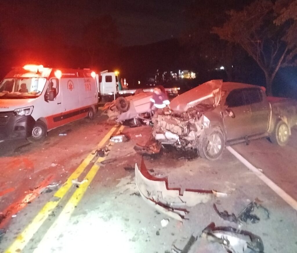 DINÂMICA DO ACIDENTE Segundo a 1ª Cia de PMRv, o condutor da Toyota Hilux, de 55 anos, seguia sentido Divinópolis/Itaúna quando deparou com o Fiat Palio, que seguia sentido contrário, na contramão de direção, ocorrendo a colisão frontal.
