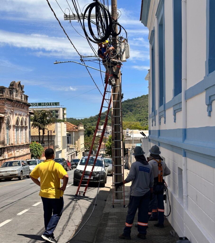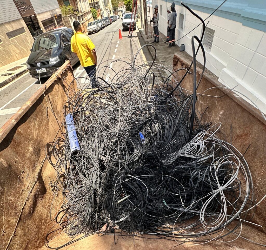 Com apoio de empresas de internet e telefonia, a Cemig iniciou nesta semana, no Centro, uma força-tarefa com o intuito de retirar cabos inutilizados espalhados pelos postes de Itaúna. A ação foi solicitada pela Prefeitura e a Câmara Municipal e avançará nos bairros com situação mais crítica, tendo como foco aumentar a segurança da população e melhorar o visual urbano, eliminando fios que, além de oferecer riscos, impactam negativamente a estética das vias. Apesar de o problema ser recorrente, uma lei aprovada em maio de 2021 em Itaúna obriga a identificação, alinhamento e retirada de fios excedentes em postes de energia, sob pena de multa.