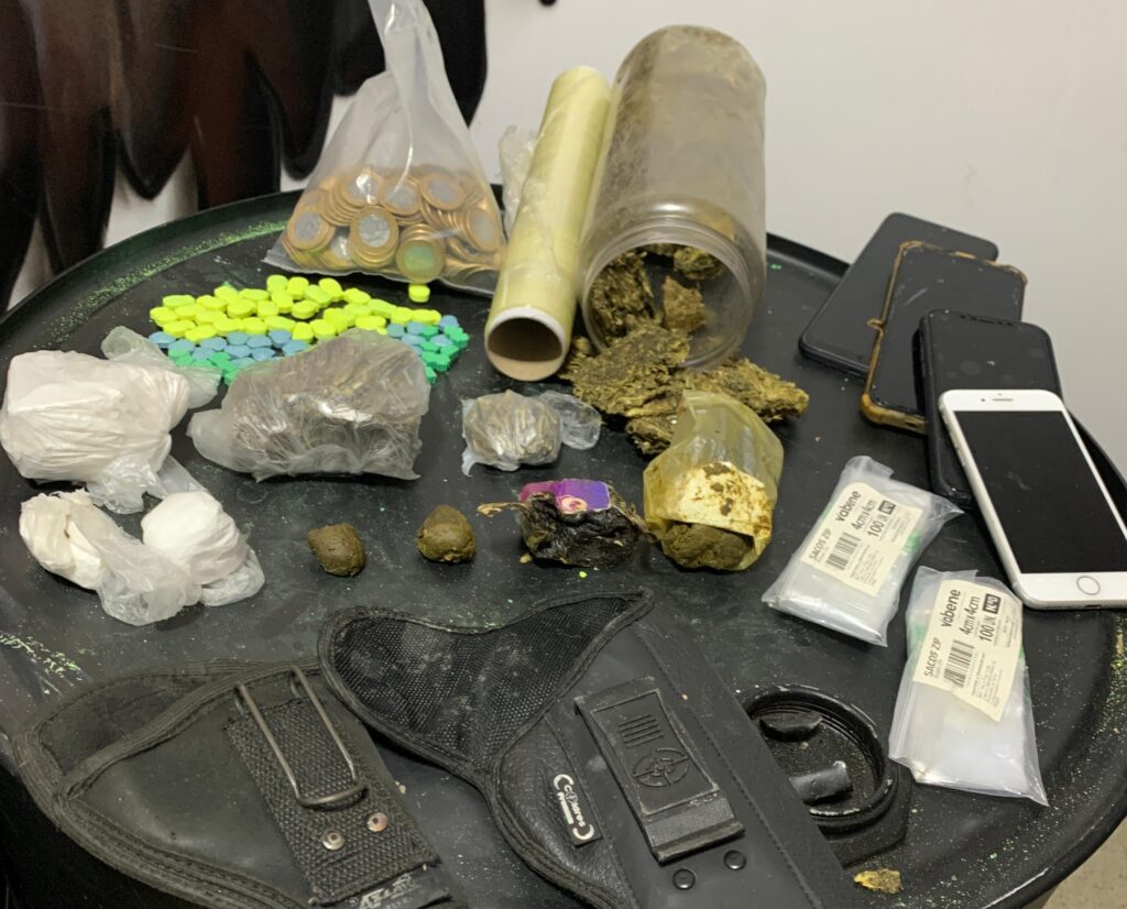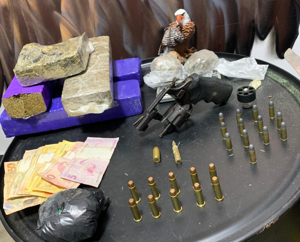 As equipes foram ao endereço indicado, onde ao perceber a presença policial, novos suspeitos tentaram se desfazer de materiais ilícitos. Em ações simultâneas pela frente e pelos fundos da residência, os policiais localizaram um revolver calibre 32, 13 munições calibre 32 CBC s. w., uma munição CBC calibre 5,56, uma munição CBC calibre 45, dez munições CBC calibre 38, cinco barras grandes de maconha, uma barra de tamanho considerável de cocaína pura, duas porções grandes de maconha, três pacotes de sacos plásticos para dolagem, uma porção de cocaína pura e duas porções de tamanho considerável de haxixe.