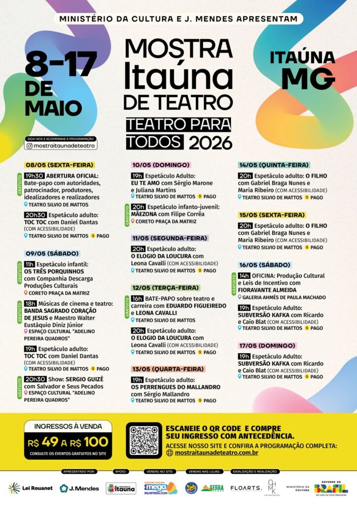Caio Blat, Sergio Guizé, Gabriel Braga Nunes, Maria Flor, Leona Cavalli e Daniel Dantas estão entre os artistas confirmados na programação da “Mostra Itaúna de Teatro | Teatro para Todos”, que acontece de 8 a 17 de maio, em Itaúna. Ao todo serão 14 atrações, incluindo espetáculos teatrais, shows musicais, encontros com artistas e atividades formativas, contemplando públicos de diferentes faixas etárias – confira a programação completa aqui. Um dos destaques é a criação de um espaço voltado para atores que também se dedicam à música. Nesta primeira edição, o ator Sergio Guizé (vocal e guitarra) realiza a estreia nacional de sua banda “Salvador e Seus Pecados”, com repertório que transita entre o rock dos anos 90 e clássicos da Jovem Guarda.